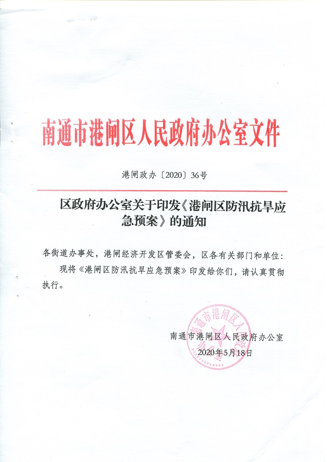 區政府辦公室關于印發《港閘區防汛抗旱應急預案》的通知