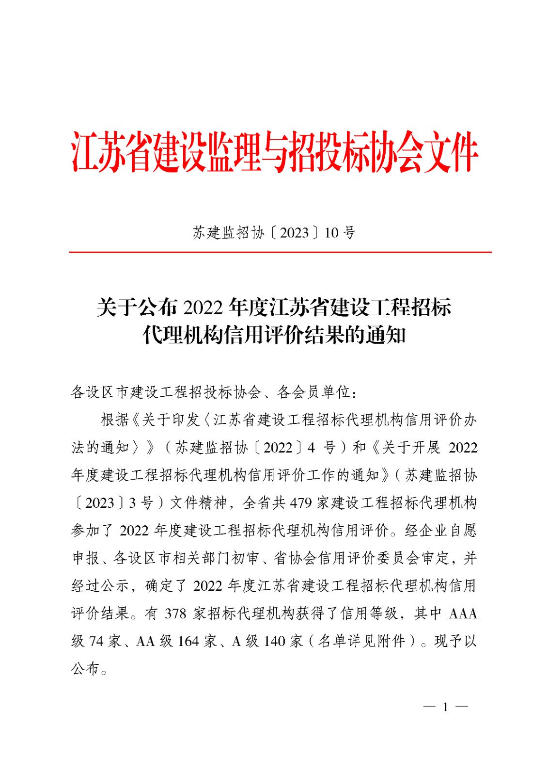 關于公布2022年度江蘇省建設工程招標代理機構信用評價結果的通知